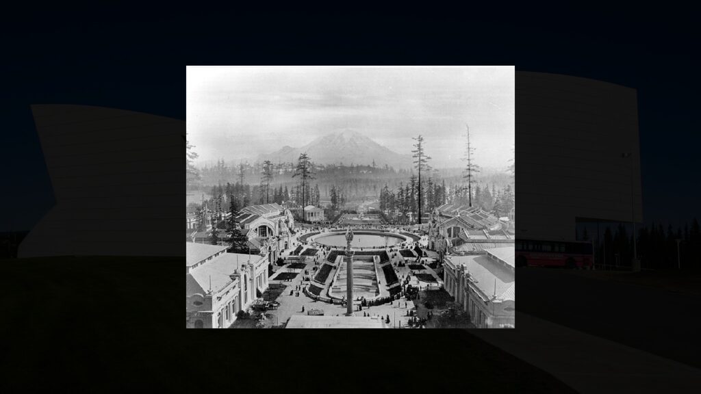 The fair hired the Olmsted Brothers from Brookline, Massachusetts to design the grounds. John Olmsted visited in October 1906 and noticed Mount Rainier standing tall to the southeast.