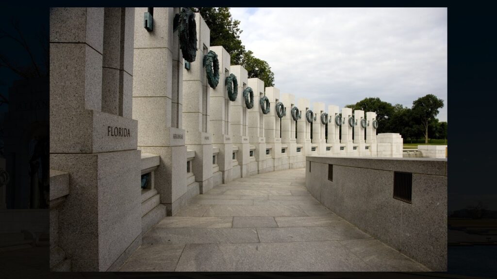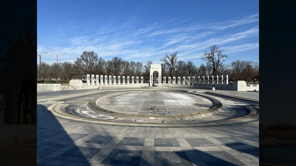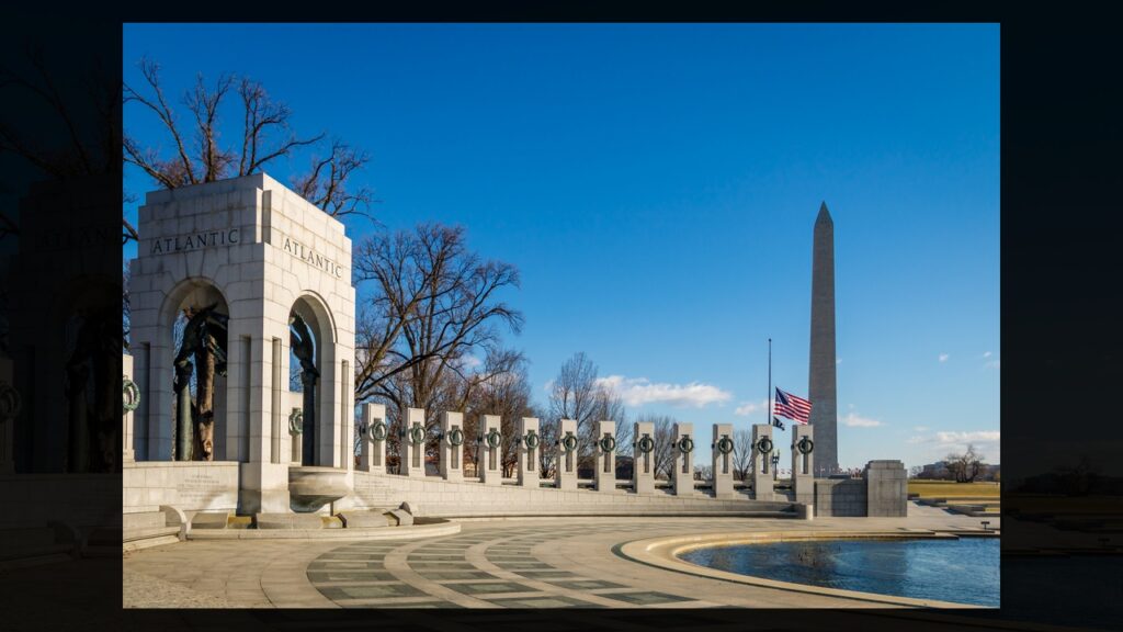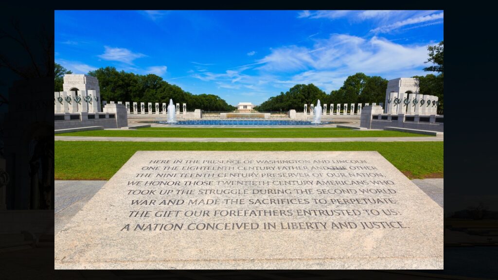 You’ll find it on the National Mall between the Washington and Lincoln memorials at 17th Street SW. It’s free and open 24 hours with 56 granite pillars representing states and territories.